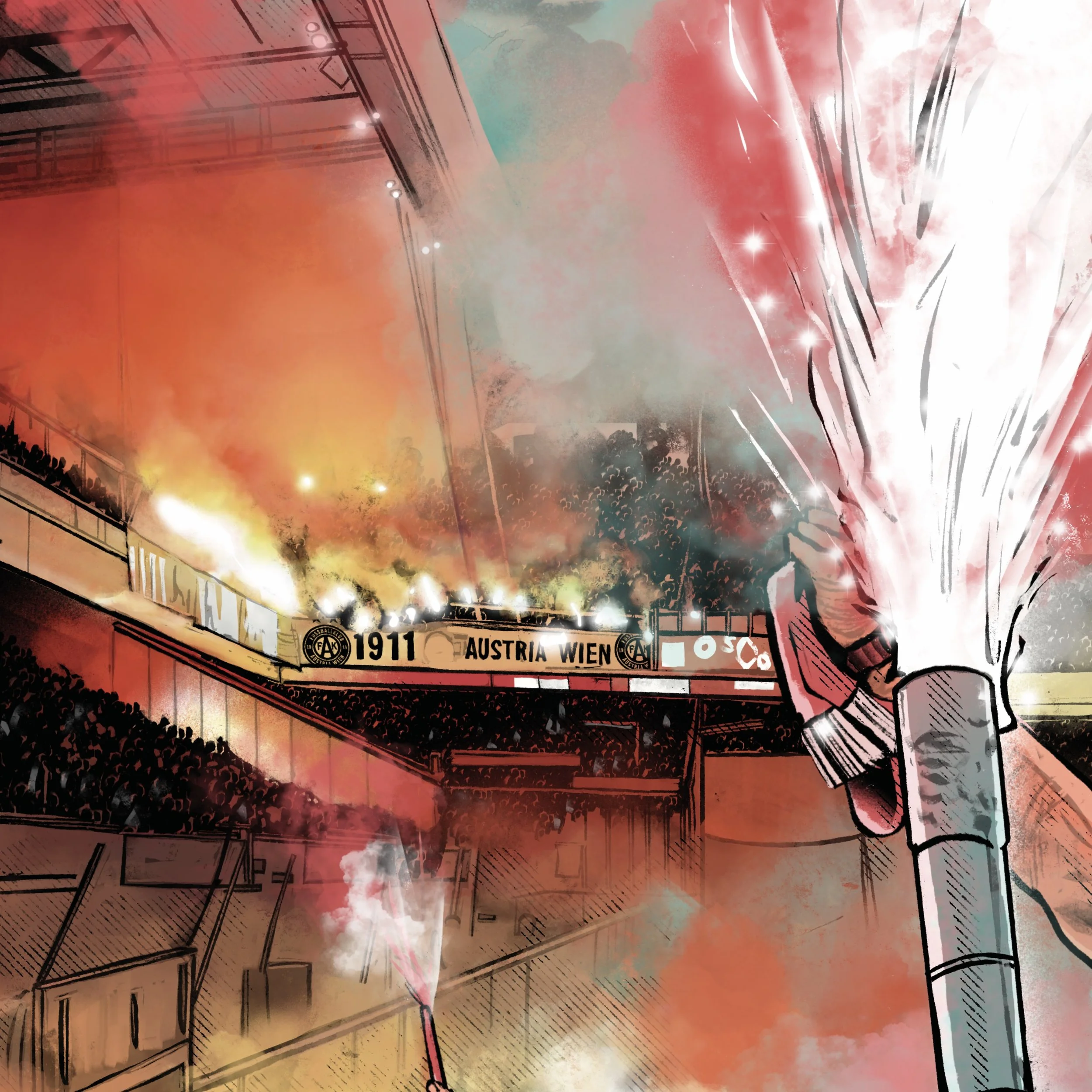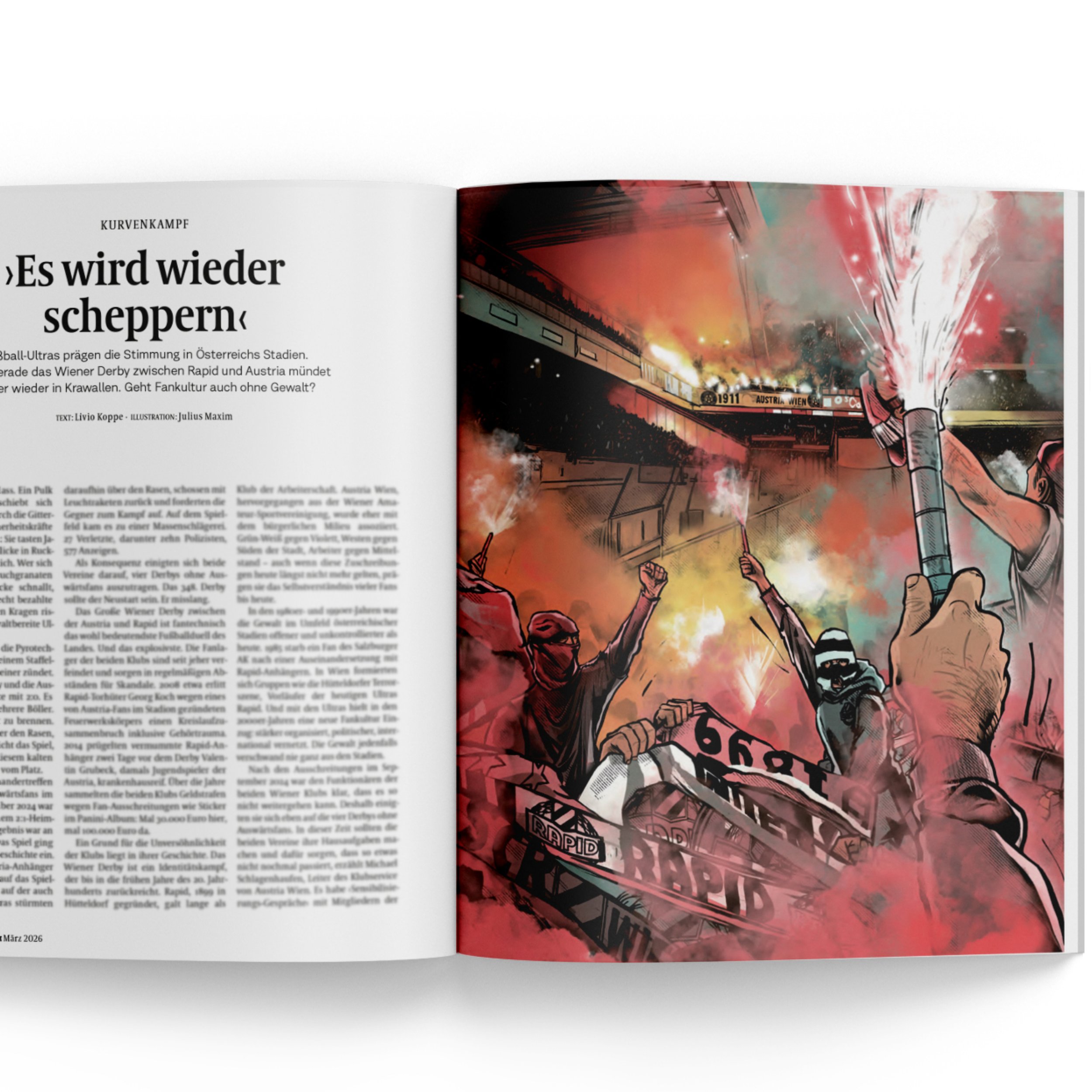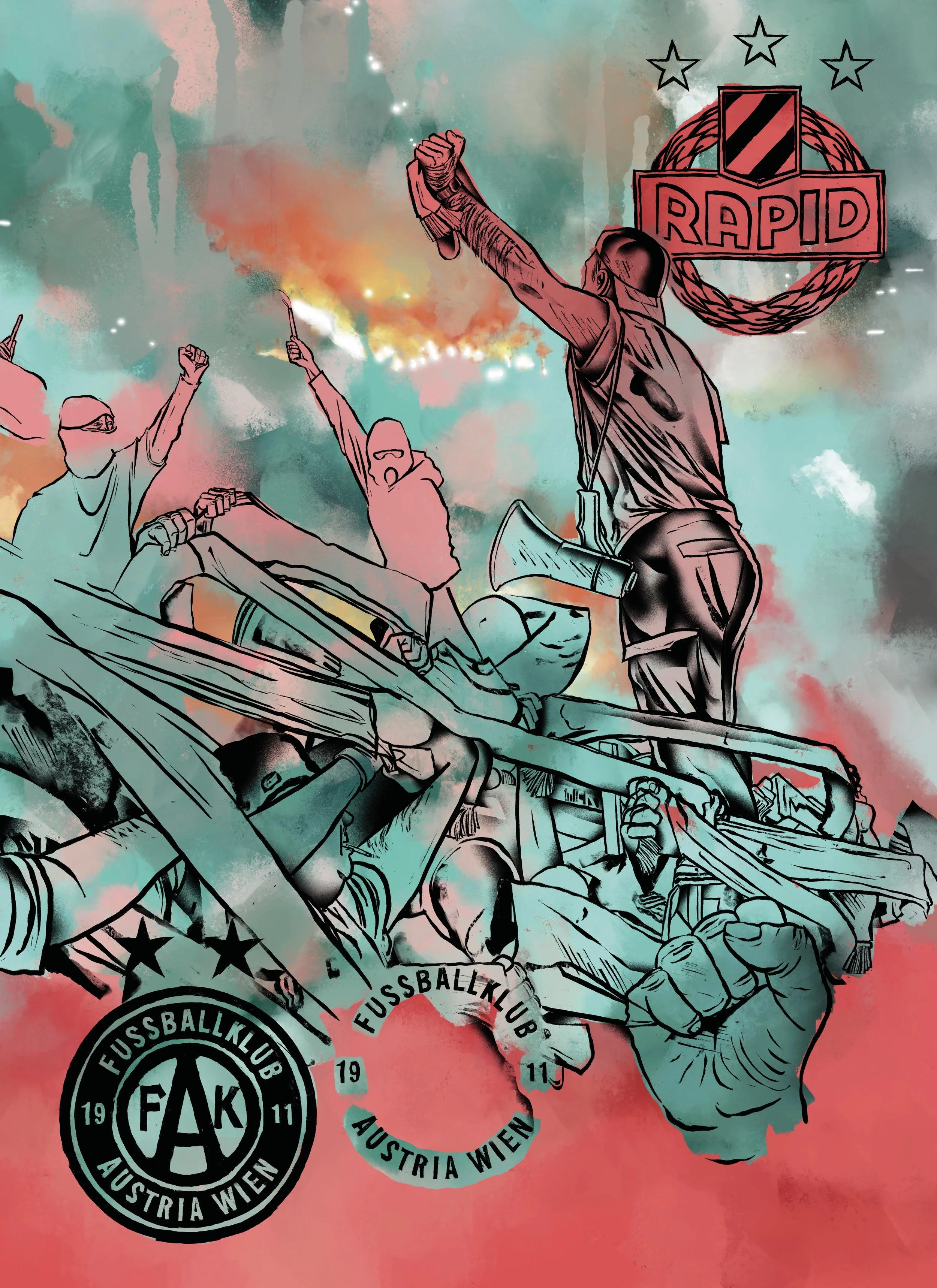 Fußball-Ultras prägen die Stimmung in Österreichs Stadien. Doch gerade das Wiener Derby zwischen Rapid und Austria mündet immer wieder in Krawallen. Geht Fankultur auch ohne Gewalt? Toller Text von Livio Koppe – und ein Thema zum Zeichnen, wie für mich gemacht!