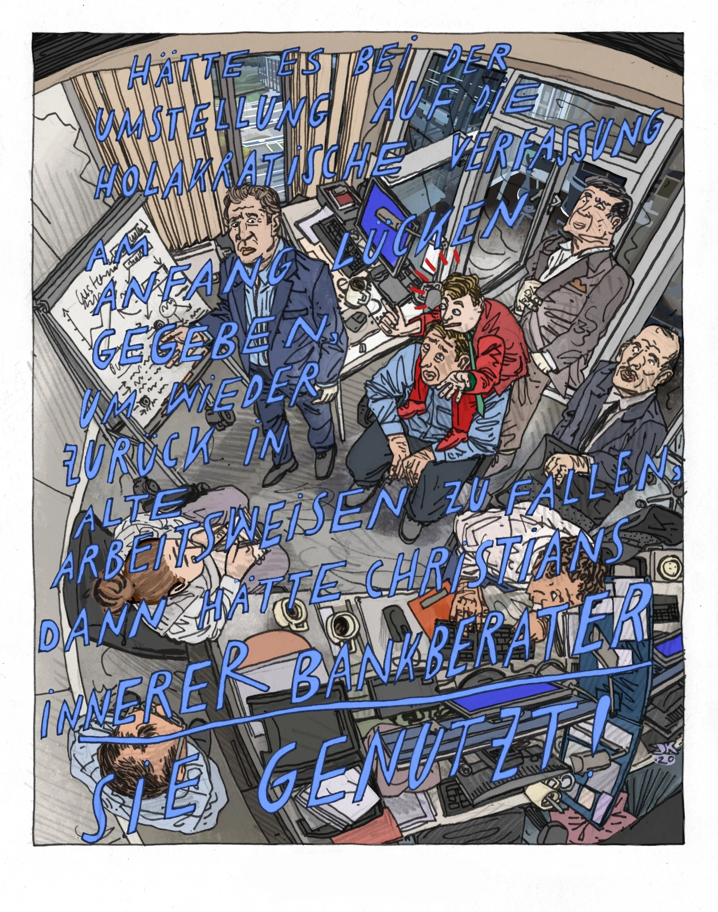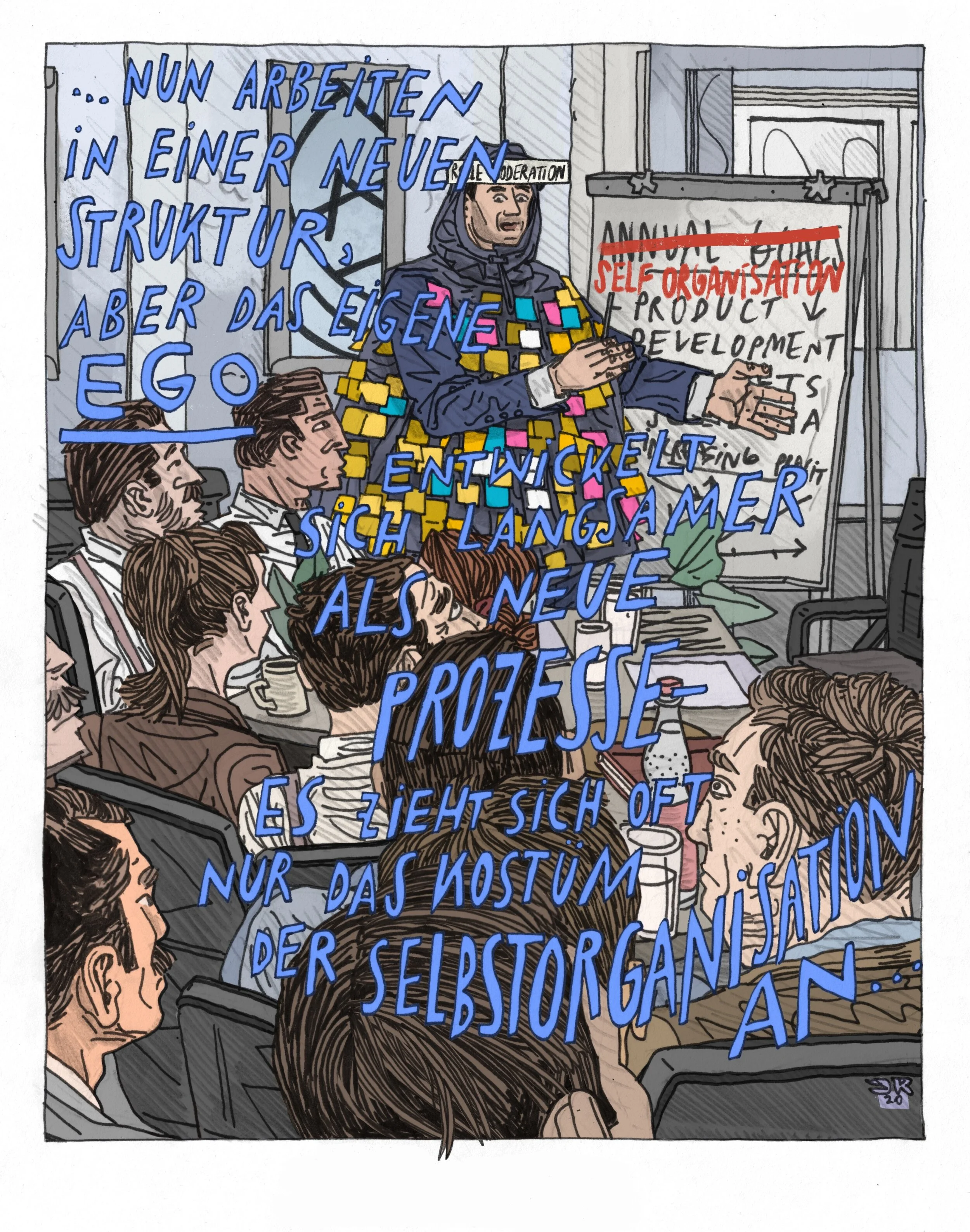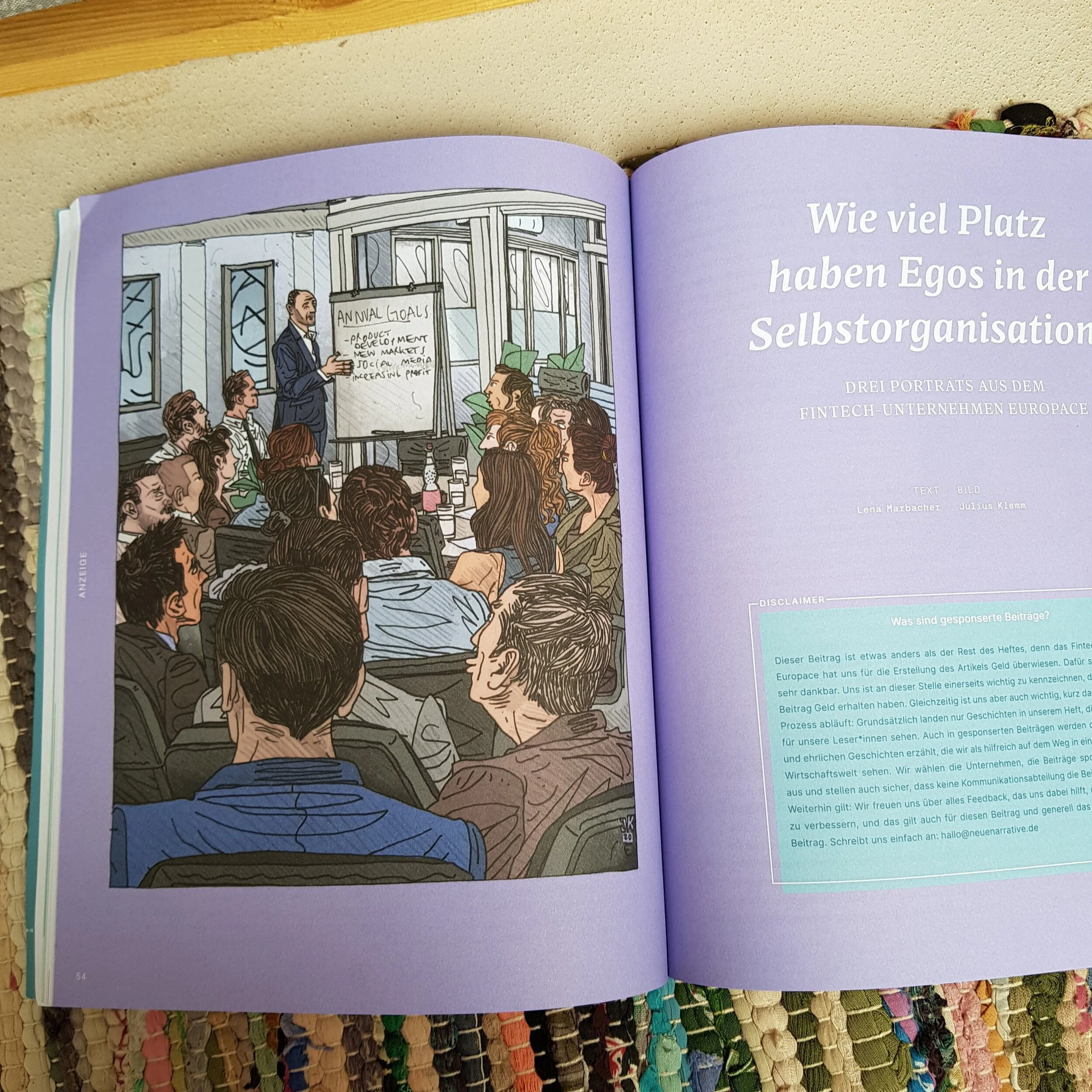 Neue Narrative Magazin — “How much room do egos have in self-organization? Three Portraits from the Fintech Company Europace” — six single-pages - analog drawings, digital colirzed - April/May 2020