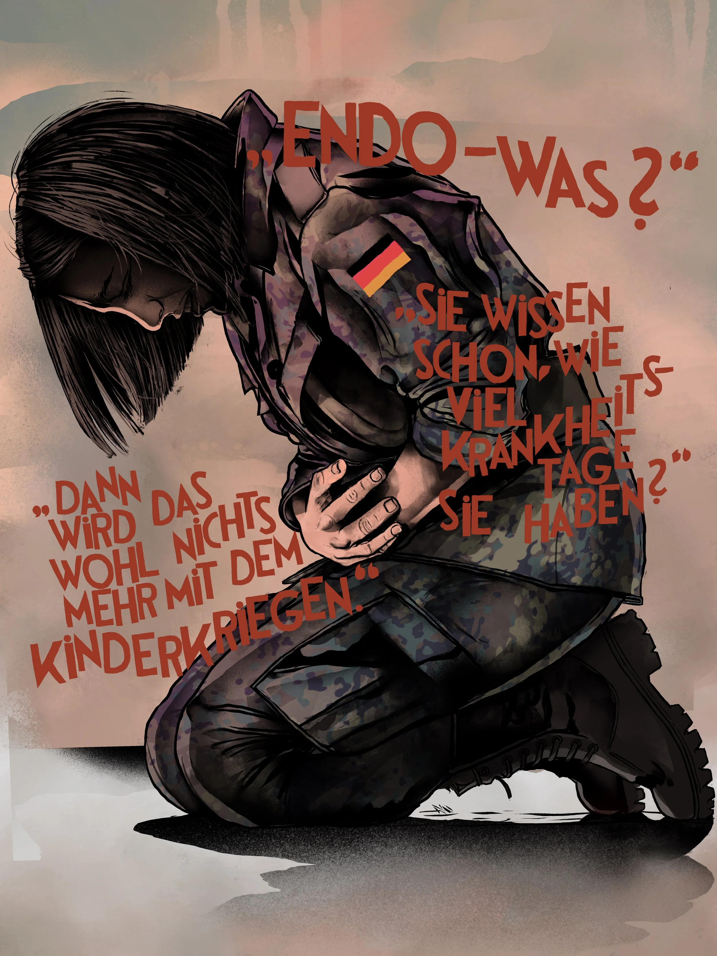 I had the opportunity to work on the important topic of “endometriosis” for JS Magazine and draw a lead story. This is a disease that affects almost every tenth woman and occurs to varying degrees, in severe cases it causes very severe pain and cramps in the abdominal area. There is a report on how it is dealt with in the german Bundeswehr - and that some doctors and colleagues are not quite up to the task.